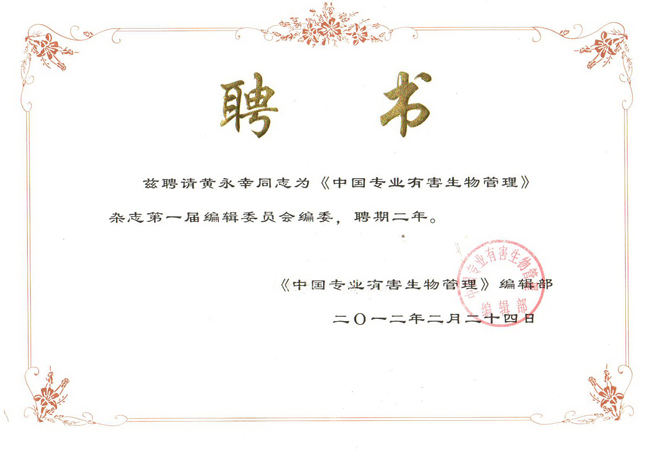 2012年2月24日公司總經(jīng)理黃永幸先生當(dāng)選《中國專業(yè)有害生物管理》雜志第一屆編輯委員會(huì)編委。